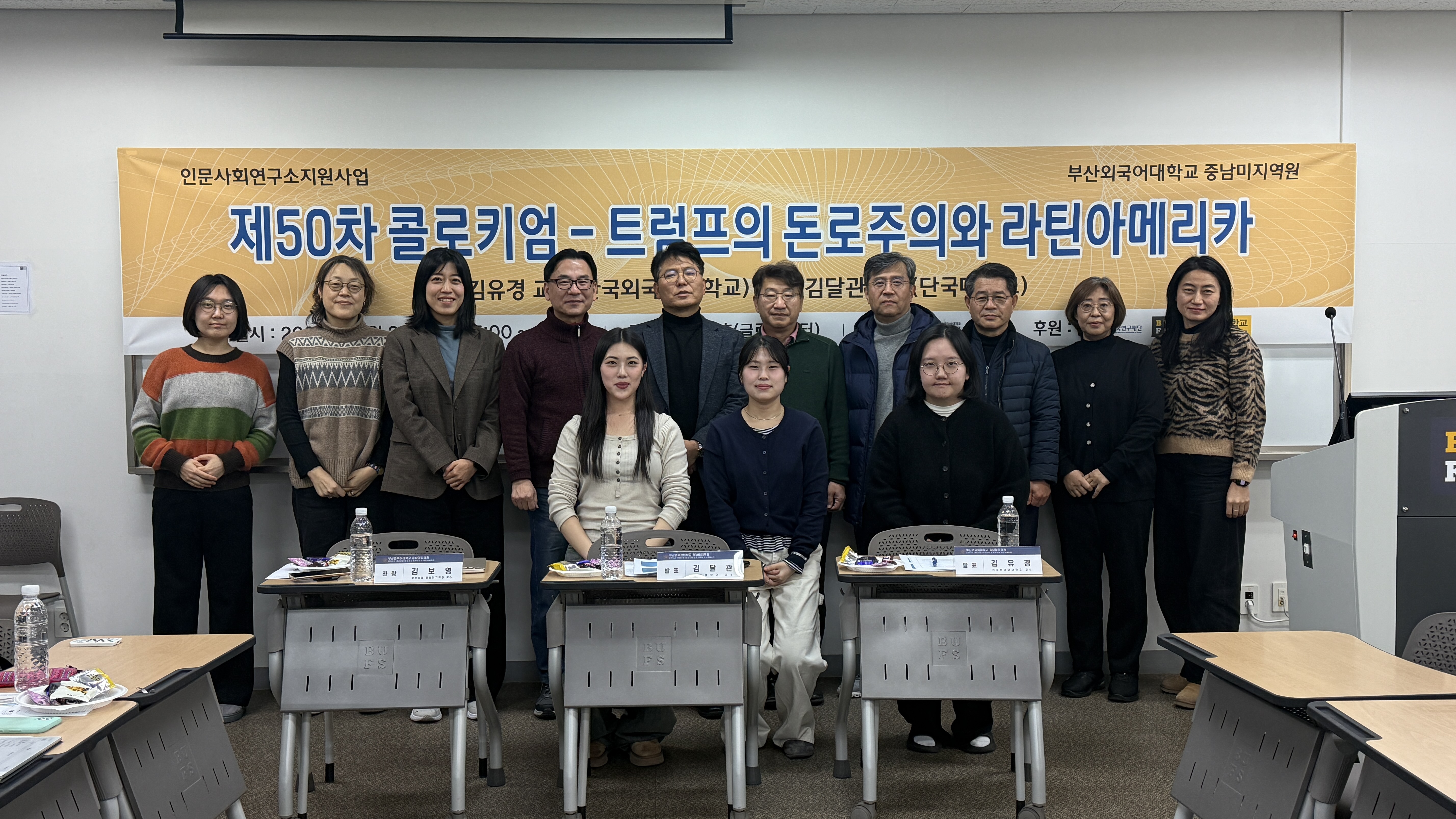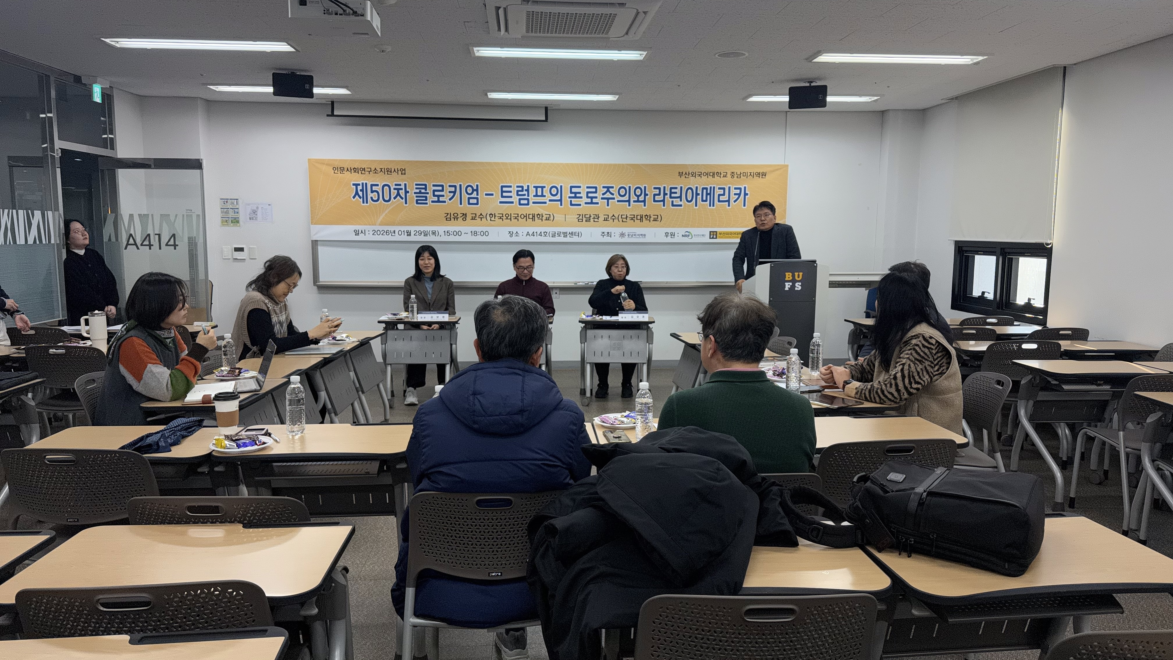 | 기타정보 : 부산외국어대학교 중남미지역원은 2026년 1월 29일 목요일, 본교 A동에서 <제 50회차 중남미지역원 콜로키엄>을 성공적으로 개최했습니다. 강연 후에는 활발한 질의응답이 이어지며 참가자들의 관심과 호응을 확인할 수 있었습니다. 이번 50회차 콜로키움은 트럼프의 돈로주의와 라틴아메리카에 대한 학문적 이해를 확장하는 뜻깊은 시간이었습니다. | ||