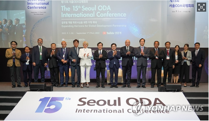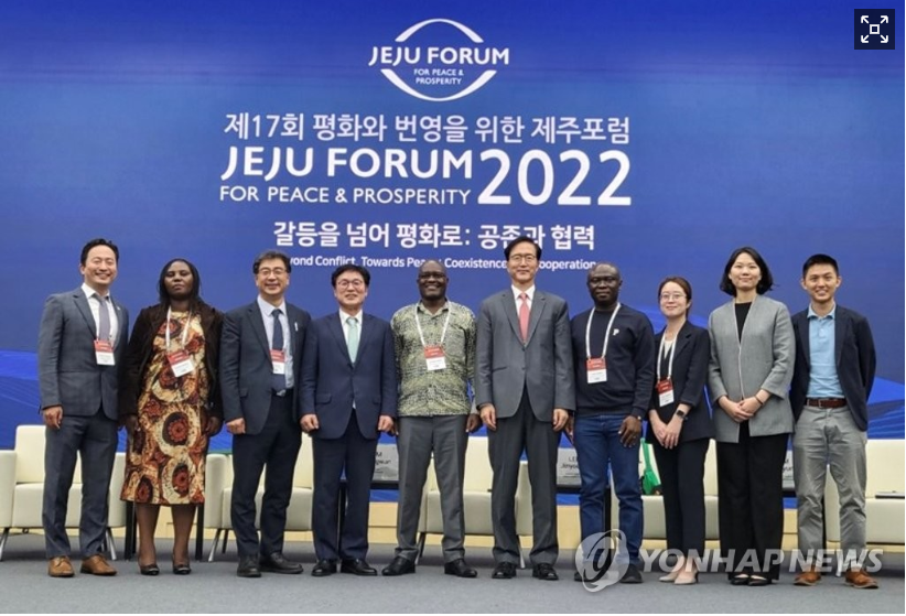 (서울=연합뉴스) 손혁상 코이카 이사장(왼쪽 네 번째)과 이윤영 코이카 이사(오른쪽 다섯 번째)가 14일 제주도 서귀포시 제주국제컨벤션센터에서 열린 '제17회 평화와 번영을 위한 제주포럼'에서 참석자들과 기념 촬영하고 있다. 2022.9.14 [코이카 제공. 재판매 및 DB 금지]