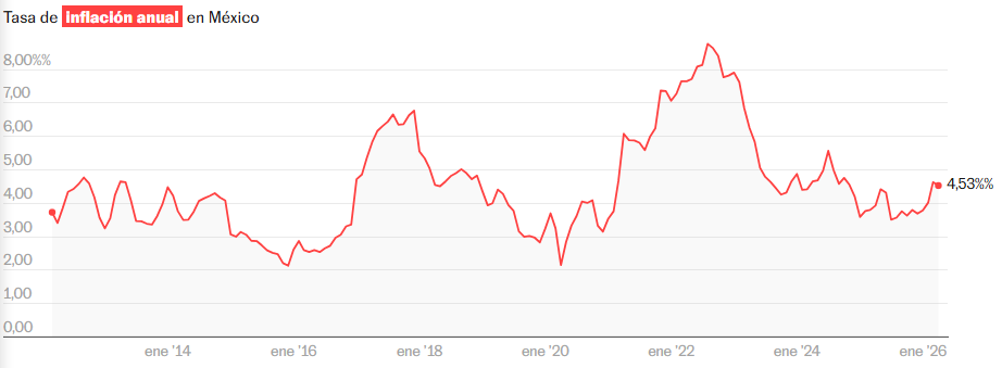 La inflación en México ha dado una pequeña tregua a los mexicanos y se ubicó en 4,53% a tasa anual durante la primera quincena de abril de 2026, de acuerdo con el informe publicado este jueves por el Instituto Nacional de Estadística y Geografía (Inegi). El Índice Nacional de Precios al Consumidor (INPC) mostró un avance de 0,11% respecto a la quincena previa, con lo que el nivel general de precios se mantiene por encima del objetivo del Banco de México (Banxico) de ubicar la inflación en un rango entre un punto porcentual arriba o debajo del 3%.