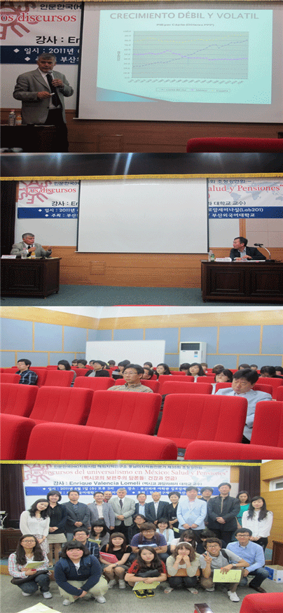안태환(HK연구교수)의 사회로 진행된 이번 초청강연회는 『Los discursos del universalismo en Mexico : Salud y Pensiones』(멕시코의 보편주의 담론들: 건강과 연금)이란 주제로 멕시코 과달라하라 대학교 Enrique Valencia Lomeli교수가 1시간 30분 강연을 하였고 30분간 열띈 질의응답의 시간을 가졌다.