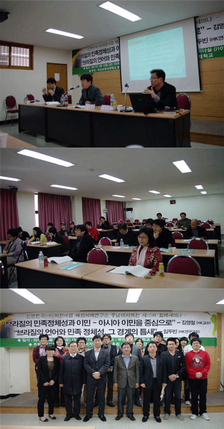 인문한국(HK)지원사업 해외지역분야 연구소 중남미지역원은 지난 4월 15일 금요일 오후3시에 부산외국어대학교 국제관 세미나실(I101)에서 제 16차 월례세미나를 개최하였다. 김우성원장의 개회사를 시작으로『브라질의 민족 형성과 이민:아시아 이민을 중심으로』라는 주제로 중남미지역원 김영철 HK교수와 『브라질의 언어와 민족 정체성, 그 경계의 틈새』라는 주제로 중남미지역원 임두빈 HK연구교수의 발표가 진행되었다. 이번 월례세미나에서는 브라질의 민족정체성 형성 과정에서 발생했던 많은 아시아인들의 이민은 브라질 민족정체성을 형성하는 방향과 일치하고 있다는 것을 알 수 있었고 브라질 민족의 새로운 탄생과 그 미래에 대한 낙관주의적인 시각을 발전시킨 시대에 질베르토 프레이라는 브라질 민족 정체성에 대한 대변인 역할을 했다고 평가된다.