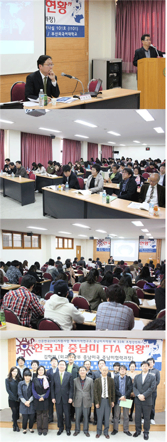 인문한국(HK)지원사업 해외지역분야 연구소 중남미지역원은 지난 4월 13일 수요일 오후3시에 부산외국어대학교 국제관 세미나실(I101)에서 제 33차 초청강연회를 개최하였다.김영철(HK교수)의 사회로 진행된 이번 초청강연회는 김우성원장의 개회사를 시작으로『한국-중남미 FTA 현황』을 주제로 외교통상부 중남미국 김학재 중남미협력과장이 약 1시간반에 걸쳐 강연을 하였고 30분간 질의응답시간을 가졌다. FTA의 기본 개념과 전 세계적인 확산을 살펴본 후 우리나라의 전반적인 FTA 정책과 현황에 이어 중남미 국가와의 FTA 진행 상황과 향후 FTA 정책 방향에 대해 알아보았다. 현재 한국은 2004년 4월, 중남미 국가중 최초로 칠레와의 FTA가 발효된 이후 페루 (2010년 정식 서명), 멕시코, 메르코수르(MERCOSUR), 콜롬비아, 중미 7개국 등과 FTA를 모색 중이다.