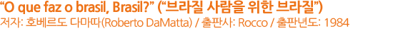 이 책의 저자 호베르또 다마따(Roberto DaMatta)는 브라질에서 가장 영향력 있는 인류학자들 중의 한 사람으로 꼽히며, 일반화의 오류나 고정관념을 뛰어넘는 방식으로 브라질의 정체성을 탐구하는 학자로 알려져 있다. 그는 이 책을 통해 거대 담론을 동원하지 않고 '길거리(rua)', '집(casa)', 직장, 여자, 종교, 축제, 인종 문제처럼 브라질 사회의 소소한 일상을 꿰뚫는 관찰을 통해 브라질만이 지닌 정체성을 재확인하는 작업을 벌인다. 책의 목차를 들여다보면 바로 눈치 챌 수 있듯이 이 책은 브라질 문화와 다른 문화를 비교하는 방식보다는 브라질이 두드러지게 지닌 문화적 기표들의 기저에 숨어있는 특징들을 강조하고, 브라질 일상문화 내에서 표상되는 기능들을 설명하는데 주력하고 있다. 다시 말해서, 다마따는 기존의 인류학적 연구방법론이 보여준 유럽중심사관과 이분법적 사고를 바탕으로 브라질과 브라질 사람들의 문화를 분석하는 종래의 접근 방식에서 탈피하여 일상 속에서 벌어지는 브라질 사람들의 삶을 다루는 방식을 다소 도발적인 문체로 다룬다. 학문의 틀을 빌린 해설자적인 외부의 시각보다 저자의 주관성을 걸러내지 않은 실제의 삶에서 뽑아내는 내재적 시각을 분석의 출발점으로 삼고 과학적 담론을 남용을 피하고 일상어로 푼다. 스키드 모어가 브라질을 보는 외부의 시각의 주류라면 다마따는 브라질 자신들의 속살을 들여다 보는 방식을 취하고 있다. 따라서 그의 표현대로 '집'안의 브라질사람들이 아닌 '거리'에 있는 우리 입장에서 이 책은 만만치 않다. 이 책을 통해 브라질 문화를 바라보는 다마따의 시각은 연구자를 객관화하는 전지적 관점으로 브라질의 지나간 흔적과 오늘을 보는 게 아니라 지금 현재의 브라질의 공시태를 브라질인의 내재적 시각을 통해 브라질의 정체성을 탐색하는 것이다. 따라서 글을 읽다 보면 브라질 사람들 간에 공유하는 문화적인 전제따위는 건너뛰어 버린다. 외국인 독자가 소외감을 느낄 정도로. 다마따가 보는 브라질은 이 책이 출간된 후 몇 년 뒤에 출판된 "브라질 사람(O Povo Brasileiro)"에서 다르시 히베이루(Darcy Ribeiro)가 "브라질 사람"에 대해 "그 어떤 다른 누구의 복제품이 아닌 독창적인 존재"라고 했던 것과 일맥상통한다. 그러나 이 책이 출판되던 당시에는 다마따의 방법론 자체가 소수자의 시도였기에 대부분의 학자로부터 외면당함으로써 이 책의 서문에서 얘기했다시피 당시의 독자들을 당혹스럽게 만들기도 했다. 사실 이 책은 제목부터 범상치 않다. 두 개의 브라질이 존재한다. 하나는 소문자로, 다른 하나는 대문자로 시작된다. 이 책에서 소문자 'brasil'은 브라질의 국명의 기원이 된 나무와 같은 그 어떤 무생물적인 것을 가리키며, 대문자 'Brasil'이 가리키는 것은 민족, 국가, 문화, 영토, 가치들의 합, 즉 브라질이 지닌 근원적인 정체성을 의미한다. 다마따가 얘기하는 '브라질성(brasilidade)'이란 현실을 구성하고 인지하는데 브라질이 가진 개별적인 방식, 스타일, 자신만의 '일리'를 얘기한다. 이처럼 이 책은 소문자로 시작하는 'brasil'과 대문자로 시작하는 'Brasil'이 갖는 차이로부터 저자가 품고 있는 화두를 꺼낸다. 유일신이 모든 장소에 있거나 혹은 아예 존재하지 않는 것처럼, 대문자 '브라질'은 이미 알려진 부분과 미스터리한 부분을 동시에 지니고 있다. 'brasil'은 인간적인 가능성에서 주어진 것이다. 그러나 'Brasil'은 보편적인 가능성들(존재 양식, 브라질 특유의 '제이뚜(jeito)')의 조합으로 탄생했다. 다마따가 단언하기를: "사람들뿐만 아니라 사회들도 자신들의 스타일들, 일을 만들어 가는 자신들의 방식들에 의해 정의된다. 이게 바로 사회적 정체성의 문제이다." 내가 어떤 존재라는 것을 어떻게 아는가? 민족정체성은 어떻게 형성되는가? 사람의 무리가 어떻게 브라질로 변환되는가? 이상이 바로 다마따의 책을 통해 제기된 질문들로, 다분히 논쟁을 불러일으킬만한 부분들이다. 다마따가 이 책을 통해 보여주려는 것은 자신의 분석이나 기준을 강요하는 게 아니다. 주제에 대해 사람들의 관심을 최소한이나마 끌어내려하고 문제의식을 추동시키는데 있다. 이 책에서 찾고자 하는 것은 상기에 밝힌 대문자와 소문자로 쓰인 두 '브라질' 사이에 존재하는 실제 관계가 무엇인지, 브라질 사람들이 '조국'이라고 부르는 게 과연 무엇인지를 탐구하는 흥미로운 여정이라고 볼 수 있다. 다마따가 부여한 "O que faz o brasil, Brasil?("브라질은 무엇을 하고 있나?)라는 제목을 다르게 풀어보자면 "Brasil para brasileiros", 즉 "브라질인을 위한 브라질"이 우리에게 더 구체적으로 다가온다.
