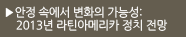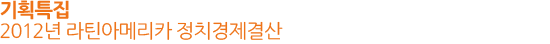 지난 2012년 라틴아메리카의 한 해를 이슈별로 간략히 정리해본다. 2012년 세계의 이목을 끈 라틴아메리카지역의 주요 정치이슈는 멕시코, 베네수엘라의 대선, 콜롬비아의 평화협정과 엘살바도르 범죄 집단과의 휴전, 아르헨티나의 석유 국유화 등을 들 수 있다. 경제는 유럽의 재정 및 금융위기로 인한 국제경제상황의 악화에도 불구하고, 비교적 좋은 성과를 보인 것으로 평가된다.