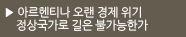 브라질, 아르헨티나 등 남미 국가들은 유럽계 자금과 유럽시장으로의 높은 수출 의존도를 보이는 등 편중된 경제구조와 중국으로의 원자재 수출 둔화 등 유럽재정위기와 중국의 성장둔화에 따른 대외리스크로 경제가 악화되고 금융시장 불안이 커지고 이에따라 투자환경도 악화되기 시작했다. 이러한 라틴아메리카 국가들의 경제위기의 원인들을 살펴보면, 첫째, 라틴아메리카 국가들은 유럽의 금융부문과 연계성이 커서 유럽 재정위기에 취약하다. 라틴아메리카 국가는 유럽은행에 대한 차입 비중이 높은데, 특히 아르헨티나의 스페인 자금차입 비중은 45.6%에 달한다. 또한 브라질 주식시장의 외국인 투자 중 34.8%, 아르헨티나 채권시장의 외국인 투자 중 58.8%가 유럽계다. 2012.3월 이후 그리스와 스페인으로 유럽재정위기가 확산되자 외국인들이 투자자금을 회수해 라틴아메리카 금융시장이 불안해졌다. 특히 아르헨티나는 2001년 디폴트에 따른 낙인효과와 정책 불확실성 증대 등으로 금융불안 정도가 가장 높다.