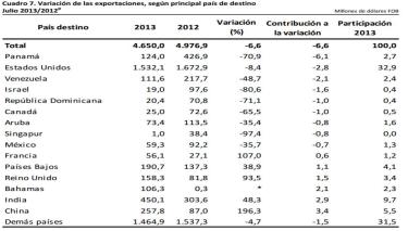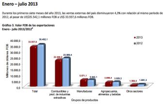 그러나 2013년 콜롬비아의 수출은 전년대비 -6.6%를 기록했으며, 최대 무역상대국인 대미 수출은 전년대비 -8.4% 감소했다. 콜롬비아정부의 대미의존도 탈피 및 무역 상대국의 다각화 노력으로 강화된 아시아지역과의 경제협력은 원자재 가격상승으로 꾸준히 강화되었으나, 올해 들어 대 싱가포르 수출은 전년대비 무려 -97.4%로 급격한 감소를 나타냈다. 파마나, 베네수엘라, 도미니카공화국 그리고 멕시코 등 역내무역 역시 감소했다.