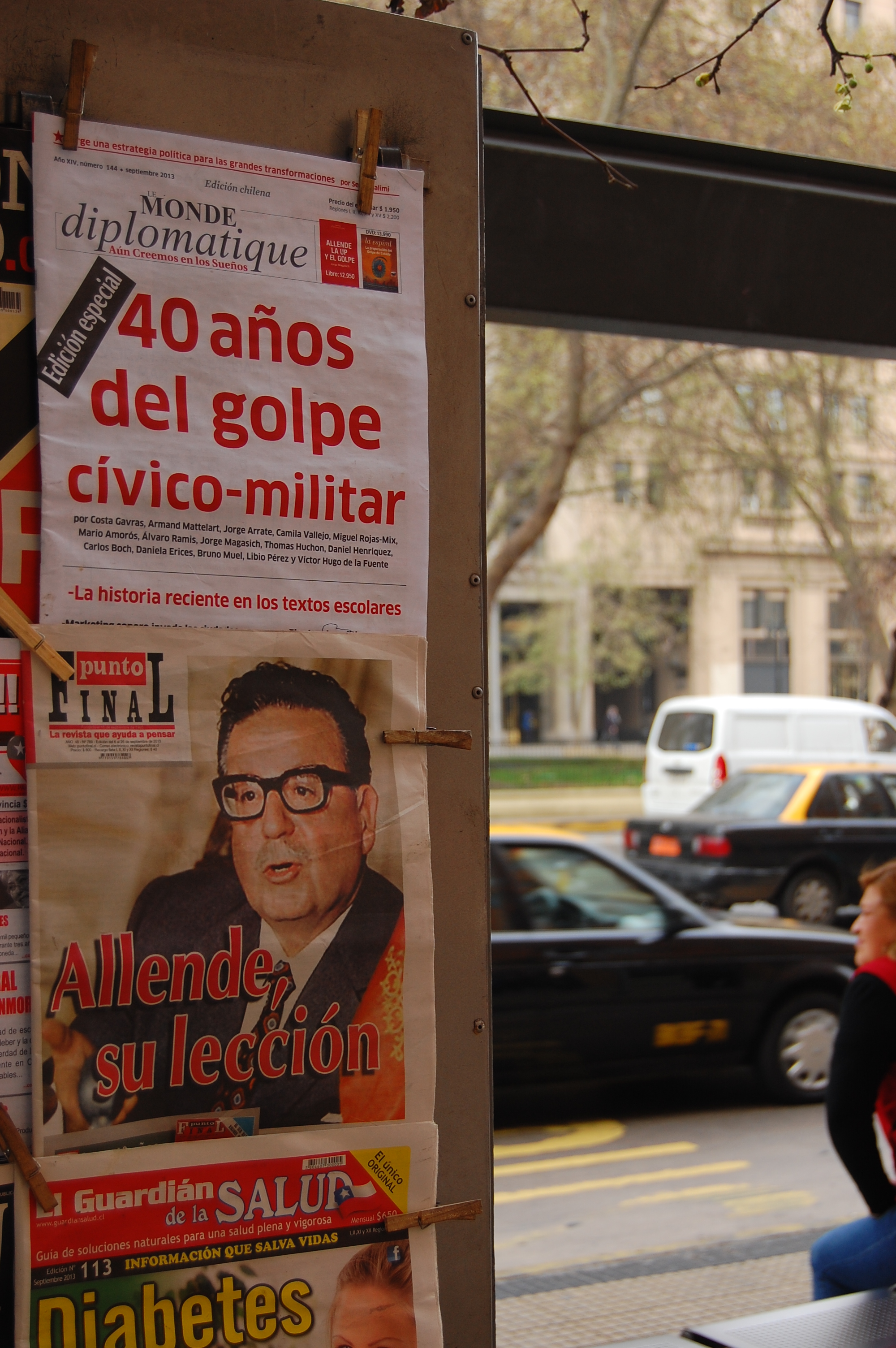 낯선 외국인의 주목을 끄는 것은 쿠데타를 둘러싼 담론이다. 40년, 강산이 몇 번이나 바뀌었을 지금도 담론은 과거를 맴돌았다. 쿠데타 당일 아옌데의 주검을 발견한 소방관과 고문현장에서 살아남은 자의 증언처럼, 과거에 대한 증언이 새롭게 이어졌다. 칠레대 본관 서점 한편에는 쿠데타 40년 특집 코너가 마련됐는데, 그곳을 매운 것은 역시 과거에 대한 증언이 대부분이었다. '주년'이라는 것이 과거에 대한 회상이더라도, 40년 전 과거에서 한 걸음도 나아가지 못한 듯 보였다.
