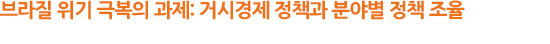 브라질의 경우 재정균형 추구 속에 분명한 선택상의 실수를 저질렀다. 기업과 소비자들에 대한 금리가 기준금리에 비해 종종 높아졌고, 이 역시 경제 위축의 결과를 가져온 것이다. 즉 신용 대출과 융자가 불가능하게 된 것이다. 따라서 재정정책과 통화정책 사이에 일관성과 장기적 관점과 중요하다. 재정정책의 지속성 추구가 필요하지만 단기간에 이를 실행하려는 것은 불가능하다. 현 국면에서 중요한 변화를 모색하려면 커다란 결단력이 필요하겠다:
