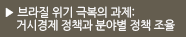 현재 브라질 정부는 그야말로 줄타기 정국에 휩싸여 있다. 선거과정 문제와 부패스캔들은 정부라는 존재의 정당성을 유명무실케 하고, 경제정책의 실패는 허약한 정치 근간을 더욱더 흔들고 있다. 2년 전만해도 브라질 경제는 현재와 같은 위기가 닥칠 것이라고 의심조차 하지 않았다. 2003년부터 시작된 노동자당(PT) 정부의 정책은 시기적으로 매우 효과적으로 진행되었고, 세계 7위 경제 대국으로의 부상과 임금상승과 실업률 하락, 빈곤과 빈부격차의 축소 및 중산층 증가는 내수지향 소비를 긍정적으로 이끌어냈다. 그러나 이 모든 결과가 2014년 중반부터 와해되기 시작했다. 실업률 상승이 좀처럼 멈추지 않는 가운데, 2014년 12월 4.3%에서 2015년 7월 7.5%를 기록했고, 2016년 1사분기에는 11.2%로 치솟으며 1140만명의 실업자를 냈다. 연방정부의 부채와 적자는 인플레이션 상승과 높은 금리와 함께 고질적인 정치문제로 부각되었으며 현재 일부 주정부들은 공무원 임금지불의 어려움까지 겪고 있다. 이와 더불어 노동자당 정부에 대한 비판여론은 지우마(Dilma Rousseff)정부의 페트로브라스(Petrobras) 부패비리사건과 같은 선동적 사건에서 그 원인을 찾고 있지만, 이러한 비리의 내막에는 브라질 재정정책의 오류와 모순이 자리잡고 있다.