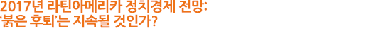 이런 경제상황의 변화는 정치 정세에도 많은 영향을 가져 올 것이다. 라틴아메리카에서 좌파의 소위 ‘붉은 후퇴’가 지속될 것인지의 여부는 결국 대선의 해라고 할 수 있는 2018년이 되어야 확실히 판가름 날 것으로 보인다. 2018년에는 멕시코를 비롯해 브라질, 콜롬비아, 파라과이, 베네수엘라 등에서 대선이 실시된다. 베네수엘라에서는 급진좌파인 차베스주의가 막을 내릴 가능성이 높지만 트럼프에 의해 가장 큰 영향을 받고 있는 멕시코에서는 최근 오히려 좌파의 로페스 오브라도르가 다시 부상하고 있다. 브라질에서도 우파 후보의 승리가 확실치는 않다. 좌파의 ‘붉은 후퇴’가 대세가 되기는 쉽지 않아 보인다. 결국 중요한 것은 좌파냐 우파냐가 아니라 그들이 어떤 정책을 취할 것인가 하는 점이다. 여러 가지 현실적 여건들을 고려해 볼 때 외채위기나 다른 형태의 경제위기와 같은 급박한 상황이 발생하지 않는 한 라틴아메리카에서는 좌파든 우파든 급진적이기 보다 온건한 중도 개혁정책을 실현하지 않을 수 없을 것이다. 따라서 좌파의 쇠퇴이기보다는 급진주의의 쇠퇴가 대세처럼 보인다.